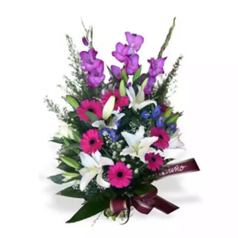 Bonito centro compuesto de gladiolos morados, lilium blanco, gerberas fucsia e iris. Agradable combinación de flores y colores para despedir al ser querido.