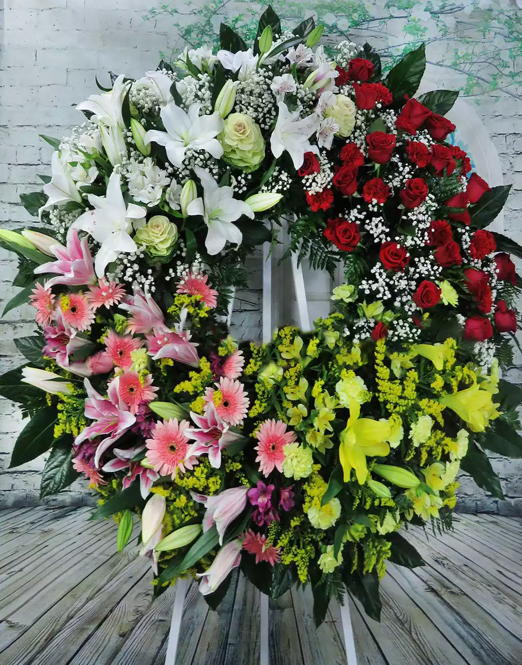 Bonita combinación de Rosas y claveles rojos, Lilium y alstroemerias blancos, brasicas, Gerberas y lilium rosas, Lilium claveles y alstroemerias amarillas. Diseño especial, exclusivo y elegante para despedir a una persona muy especial
