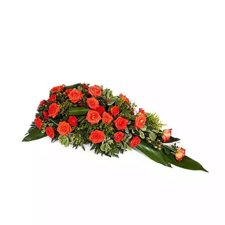 Bonita palma en tonos naranja, con rosas, solidago y verdes variados. Diseño especial para expresar condolencias.